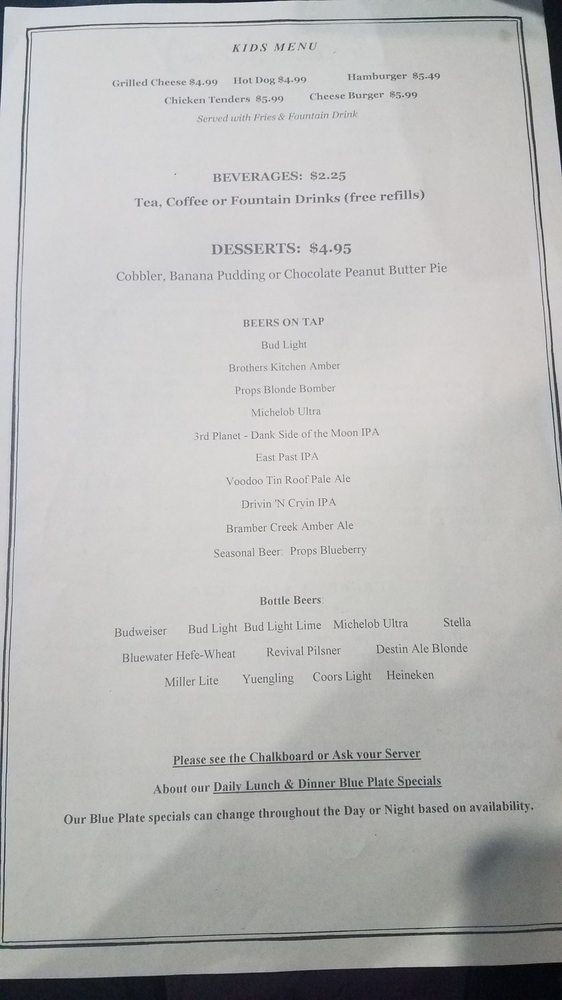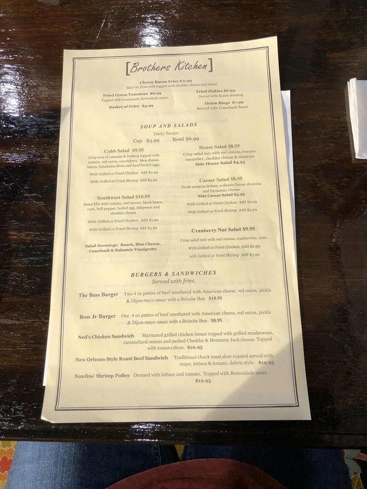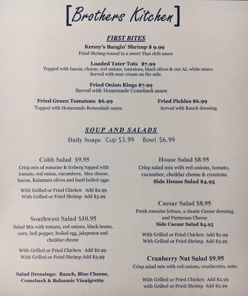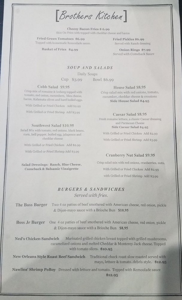 Welcome to Brothers Kitchen, a hidden gem located in Niceville, FL, offering Southern, salad, and burger cuisine. With a menu filled with delicious home-cooked entrees, Brothers Kitchen has something for everyone. Customers rave about the flavorful burgers, char-grilled to perfection, and served on brioche buns. The ribeye steak and pork ribeye are highlighted as must-try dishes, cooked tender and hot with impeccable flavor. The friendly staff and reasonable prices make dining at Brothers Kitchen a delightful experience. Whether you're in the mood for a classic burger, hearty country fried steak, or Southern favorites like collards and fried okra, this restaurant offers a satisfying meal in a welcoming atmosphere. Don't miss out on this above-average dining spot in Niceville. Visit Brothers Kitchen for a taste of Southern hospitality and home-style cooking.